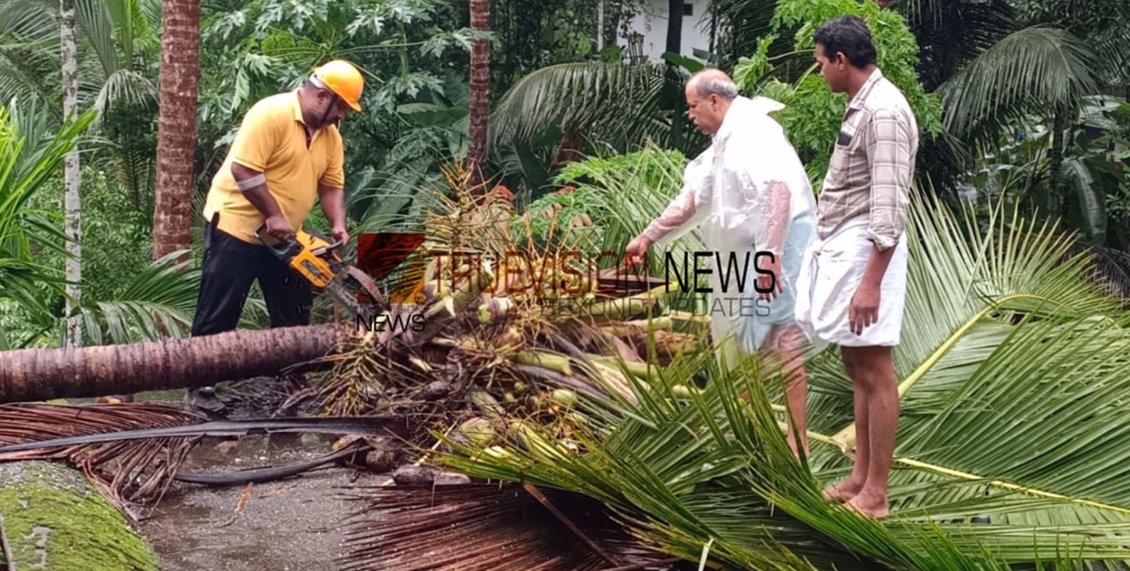 മഴ ശക്തമാകുന്നു; തളീക്കരയിൽ വീശി അടിച്ച കാറ്റിൽ തെങ്ങ് വീണ് വീടിന് കേടുപാട്