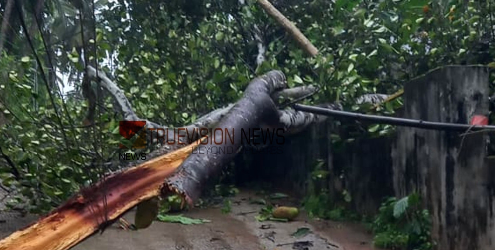 വീശി അടിച്ച് കാറ്റും മഴയും; പൈക്കളങ്ങാടിയിൽ വീടിന്റെ മതിലിനു മുകളിൽ മരം വീണു